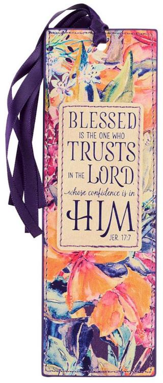 Faux Leather Bookmark Blessed is The One Jeremiah 17:7 Bible Verse, Purple Flora