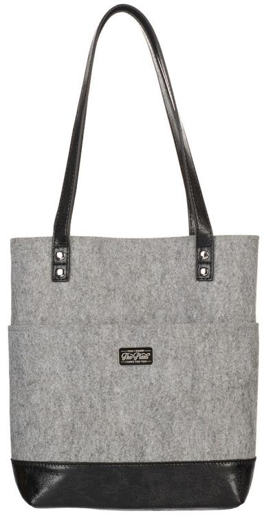 The soft gray felt exterior is wrapped with an oversized pocket covering two-thirds of the body. Black faux leather handles are attached to the tote with silver metal studs, and the 3.5″ x 9″ faux leather base of the tote offers a large enough foundation for it to stand upright. The roomy tote stands about 12 inches high, and its widest measurement is about 13 inches wide, offering more than enough space for everyday essentials.