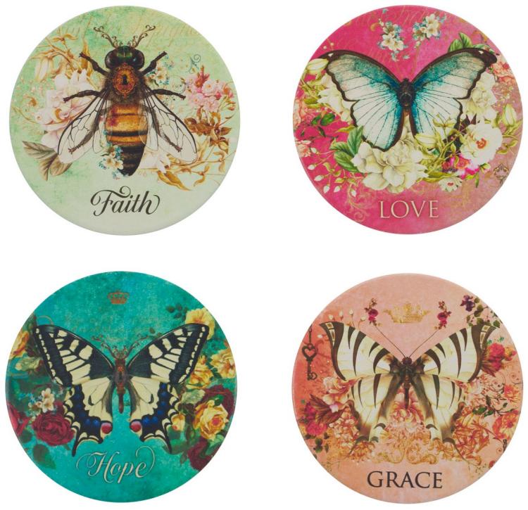 The Secret Garden Ceramic Coaster Set coordinates with the Grace Faith Love Secret Garden Butterfly Magnet Set and the Hope Grace Be Still Secret Garden Notebook Set that complements many of the Secret Garden Collections.