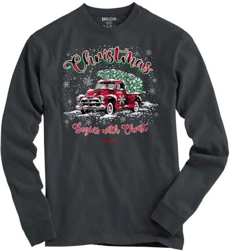 Celebrate the birth of our Savior in this nostalgic Christmas Tree Truck Kerusso Long-Sleeve T-Shirt in Charcoal. When God gave us His Son Jesus, mankind became the recipient of the greatest gift ever given. What a blessing to celebrate His birth every year on December 25, and to share the joy we ve found in faith all-year long.