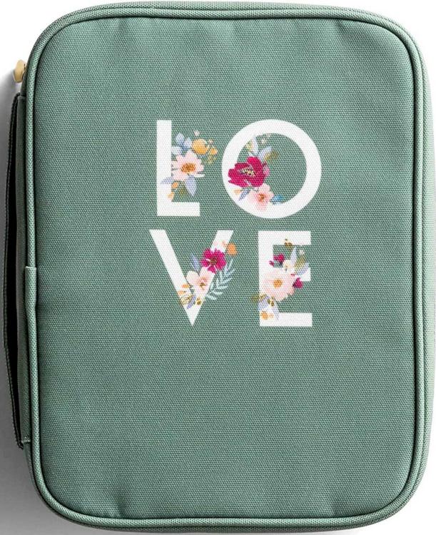 Polyester canvas Bible cover to carry and protect your Bible on the go. Designed in sage green with Love and floralaccents.