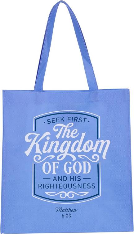 Never leave a notebook or pen behind when you use The Kingdom of God Blue Shopping Tote Bag to carry your Bible study paraphernalia. The Kingdom of God Blue Shopping Tote Bag makes a great gift bag for your trusted Bible-study leader or pastor.